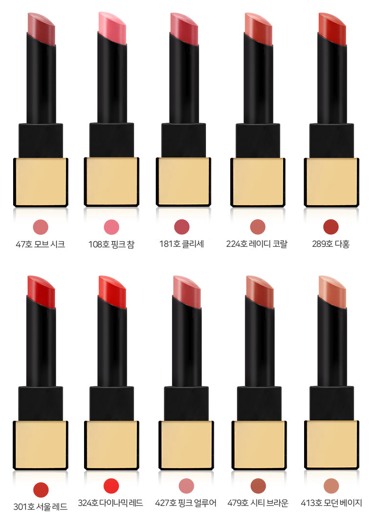 총 10가지 색상으로 제공되며, 대표 컬러 '서울 레드'는 본래의 입술 색상과 자연스럽게 어우러져 발색된다. 나머지 색상들도 입체감과 깊이감을 가지고 있으며, 서울 기반의 패션 디자이너 제이든 초와 협업하여 다채로운 색상 스펙트럼을 완성했다. 클래식한 디자인과 블랙과 골드 조화의 케이스로 품격을 더한 이 립스틱은 오랫동안 사랑받을 예정이다.