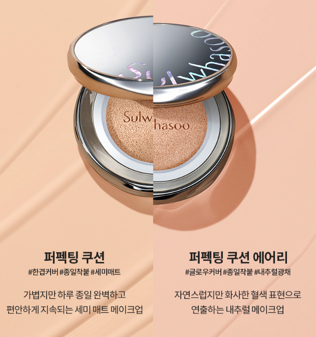 Users can choose between the Perfecting Cushion, which offers a lightweight feel with advanced 'Slim Fit Cover™ Formula,' and the Perfecting Cushion Airy, which allows for a more comfortable and radiant makeup look. Both products are rich in skincare ingredients, ensuring comfortable wear even for extended periods. The new packaging design features irregular curves and a Sulwhasoo logo made from natural mother-of-pearl, enhancing its luxury. The mother-of-pearl reflects light at different angles, symbolizing Sulwhasoo's beauty philosophy that respects the unique beauty of individuals.